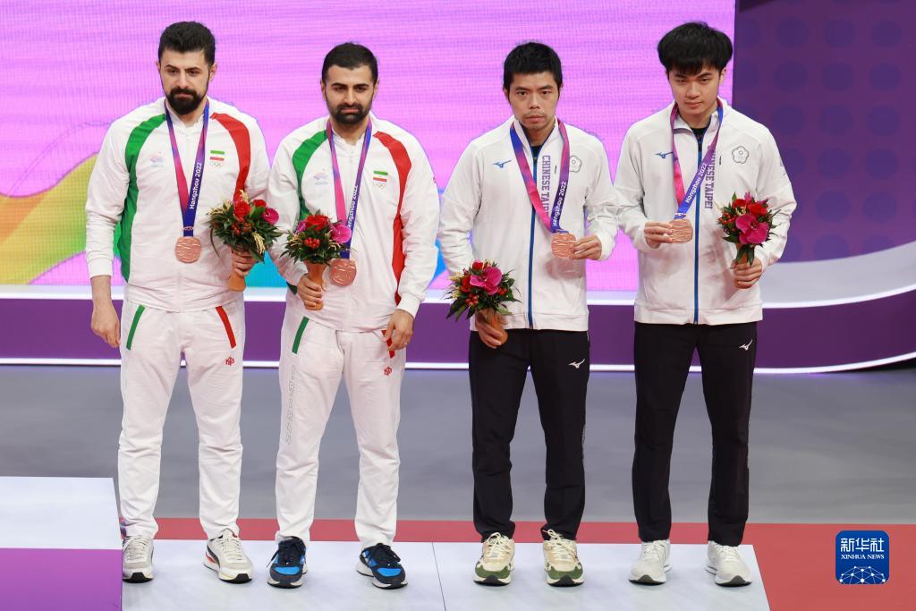 10月1日,获得季军的伊朗组合尼马·阿拉米安·达鲁恩科拉埃(左一)/诺沙迪·阿拉米扬·达龙科拉埃(左二)、中国台北组合庄智渊(右二)、林昀儒在领奖台上。
