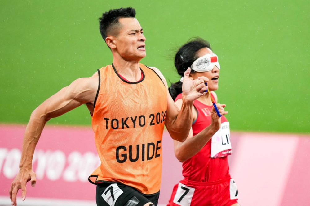 2021年9月4日,刘翠青(右)和领跑员徐冬林在东京残奥会田径女子200米T11级比赛中。新华社记者张铖摄