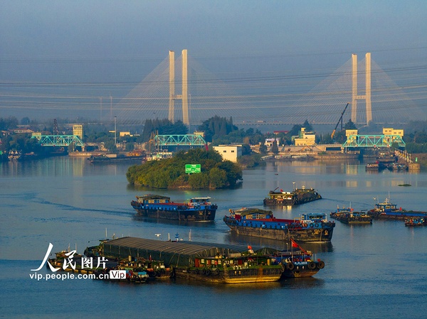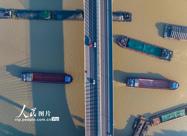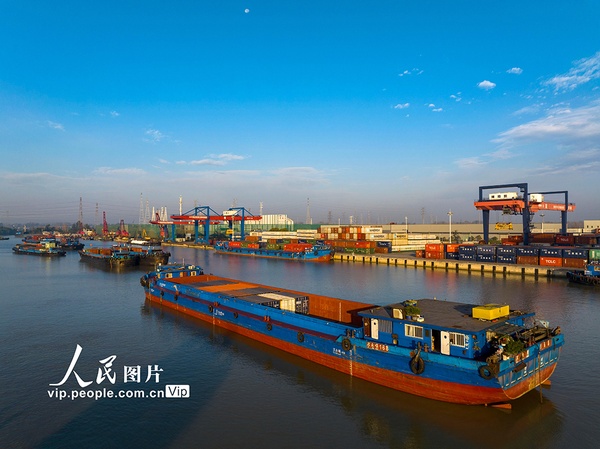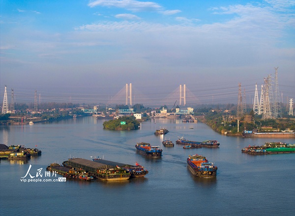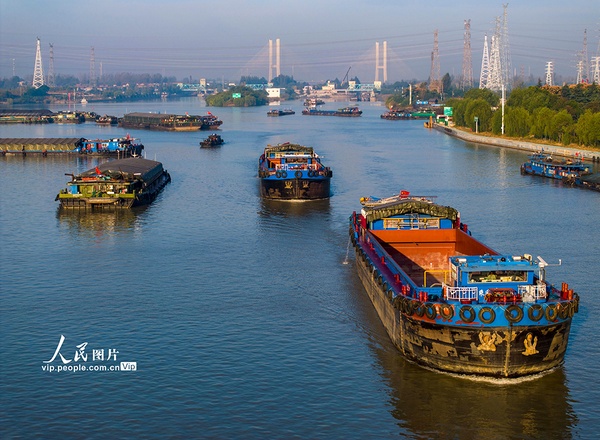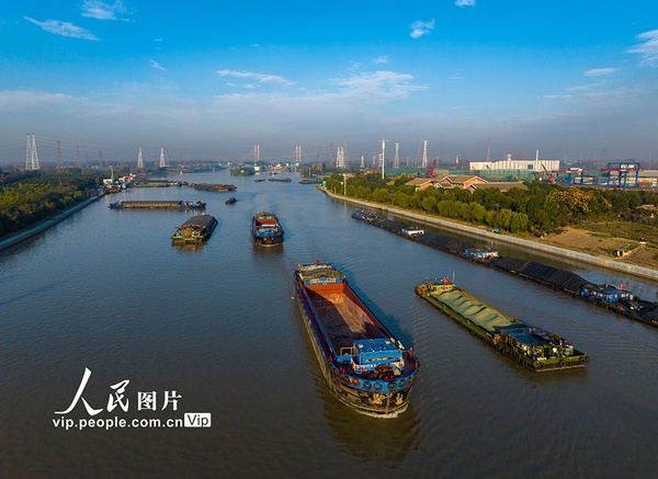 2023年11月1日,京杭大运河江苏淮安段,装载煤炭、钢材、建材等货物的船舶在航道上有序航行。深秋时节,随着多地煤炭、钢材、建材等物资的需求量增加,京杭大运河来往的货船明显增加,呈现一派繁忙景象。贺敬华摄(人民图片网)