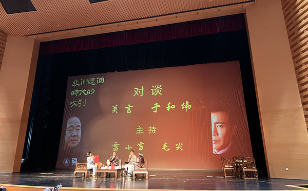 11月20日下午,在该校大零号湾文化艺术中心,诺贝尔文学奖得主、茅盾文学奖获得者莫言和华鼎奖、金鸡奖、白玉兰奖获得者于和伟,将莫言的话剧剧本《鳄鱼》搬上舞台。两个已开始“生活的戏剧”的男人,围绕“我们时代的戏剧”这一主题展开对谈。