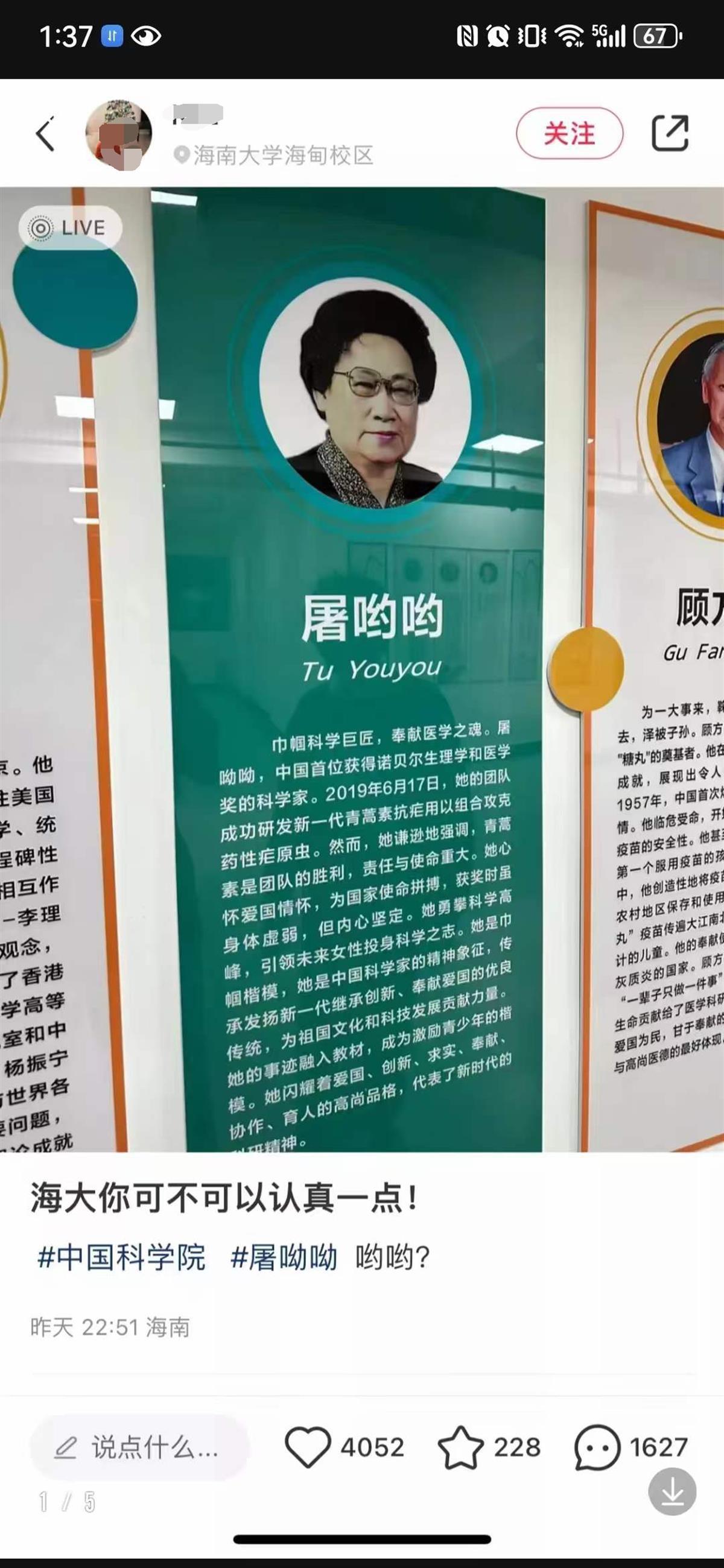 据网友发布的帖文显示,一张介绍科学家屠呦呦的海报中,将屠呦呦的名字写成了“屠哟哟”,“海大你可不可以认真一点!哟哟?”帖文上方的定位显示在海南大学海甸校区。帖文在网上发布后引发关注。28日下午,发帖人已经删除该帖。