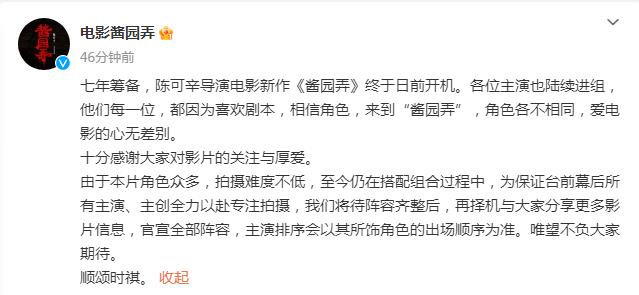电影《酱园弄》发文称,经过七年筹备,陈可辛导演的这部新作已经开机,各位主演也陆续进组。“由于本片角色众多,拍摄难度不低,至今仍在搭配组合过程中,为保证台前幕后所有主演、主创全力以赴专注拍摄,我们将待阵容齐整后,再择机与大家分享更多影片信息,官宣全部阵容,主演排序会以其所饰角色的出场顺序为准。”