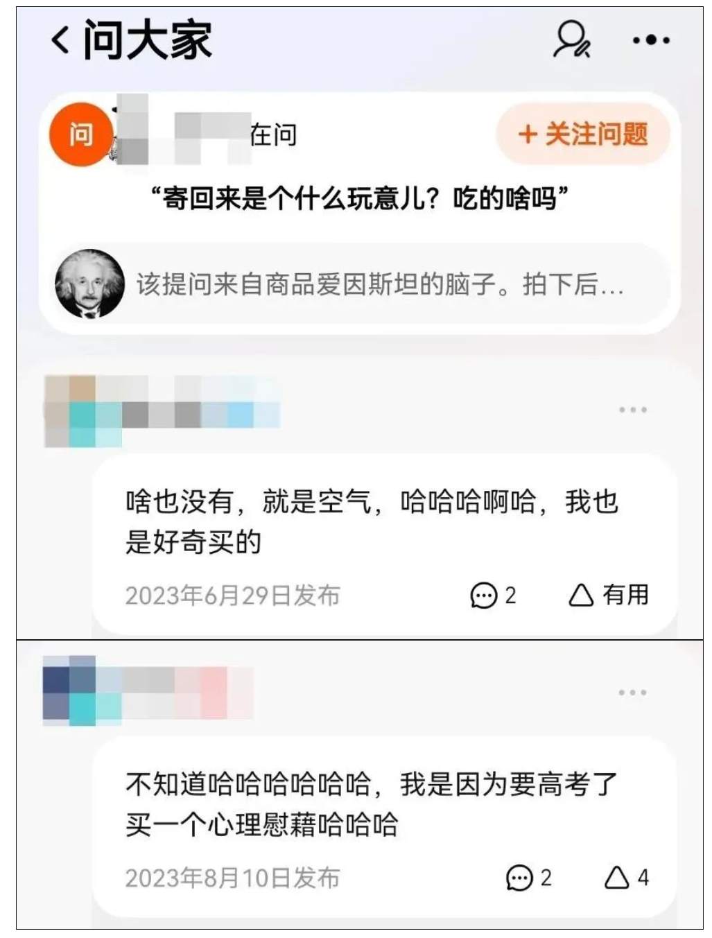 找人在线陪唠嗑、陪吐槽的“树洞倾听”服务,在电商平台上销量激增;宣称拍下后就能自动长到大脑上的“爱因斯坦的脑子”,目前已售10万+,甚至入选了淘宝2023年度十大商品;下单后商家会向指定社交账号发送“嗡嗡嗡”的“虚拟蚊子”,销量也已有100万+;此外还有骂醒恋爱脑、“好运喷雾”、“转运锦鲤”等,均有不低的销量。