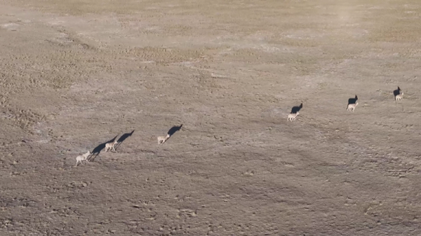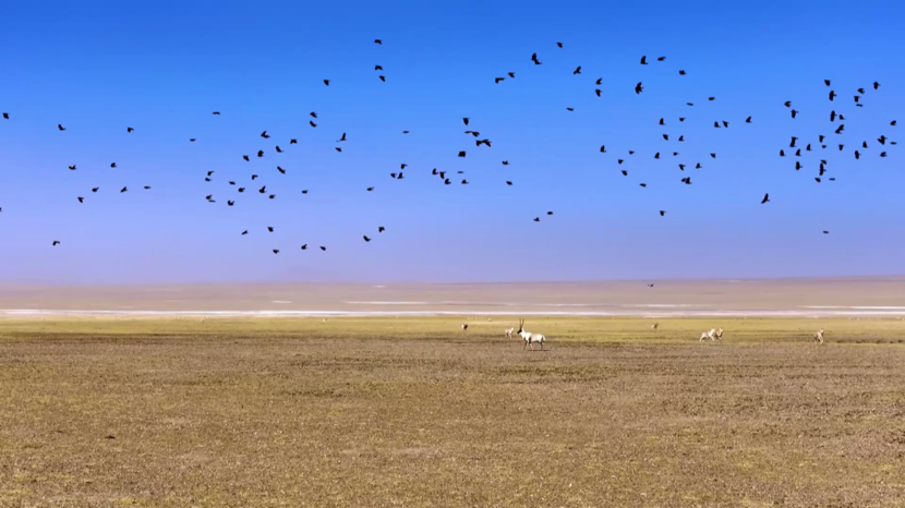 在科研人员拍摄的视频素材内,能看到阿尔金山国家级自然保护区内,巍峨群山雪峰连绵,成群的藏羚羊雌雄合群,雄性通过追逐、打斗争夺交配权,激烈的“追逐大战”在广袤高原上持续上演。