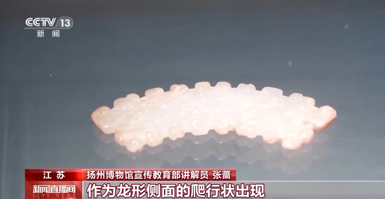 扬州博物馆宣传教育部讲解员 张蔷:这件器物的纹饰叫做夔龙纹,夔龙纹在传说当中是只有一只脚的龙,它一般在玉器当中是作为龙形侧面的爬行状出现的,所以也有一种半遮面的美感。