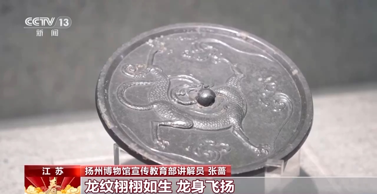 扬州博物馆宣传教育部讲解员 张蔷:这枚唐代龙纹镜,龙纹栩栩如生,龙身飞扬,给人势不可挡之感。