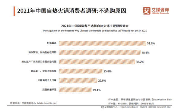 根据艾媒咨询2021年的一份关于“消费者不选购自热火锅原因”的调查问卷中,消费者认为价格偏高是主要原因,占比达到了51.6%。