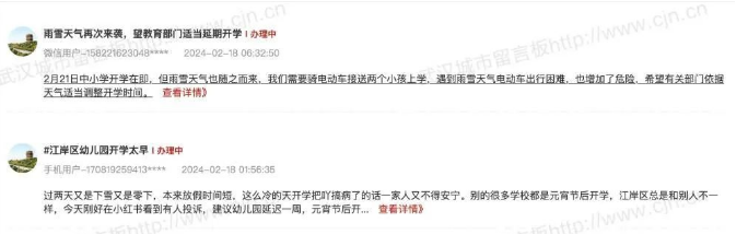 根据武汉市2023-2024学年度中小学春季校历,武汉市小学和初中计划于2024年2月20日报到,21日正式开学。最近,有不少市民在武汉城市留言板上建议:“2月21日中小学开学在即,但雨雪天气也随之而来……希望有关部门依据天气适当调整返校时间。”