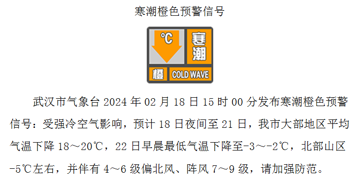 2月18日,武汉市气象台发布重大气象信息专报:2月18日夜间至24日,受地面强冷空气影响,武汉将出现寒潮大风和低温雨雪冰冻天气,致灾风险高,需加强防范。
