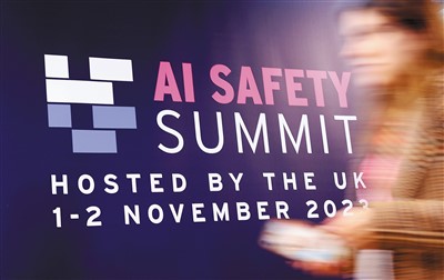 在英国布莱奇利园,一名参会者经过首届人工智能安全峰会的宣传展板。新华社记者 李 颖摄