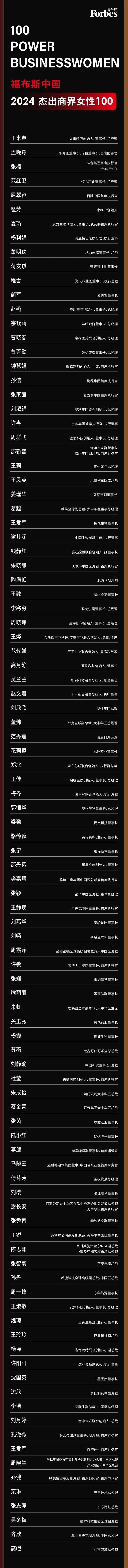 据福布斯中国介绍,今年,福布斯中国仍以国内上市公司女性管理者、入选“福布斯全球2000强”的跨国公司在华女性领导人,以及独角兽企业女性创始人为研究对象,通过对候选人所领导业务经营业绩、资本市场表现、市场规模、行业影响力、创新力等数据分析,从上千位候选人中遴选出最终100人。