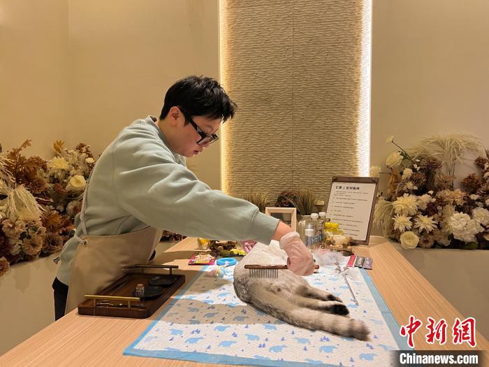 图为宠物殡仪馆内,工作人员在为去世的小猫做最后的毛发梳理。 卜小钊 摄