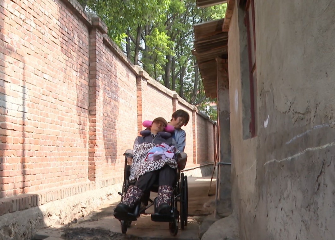 邓桂英夫妇和邻居一起将儿子从轮椅移动至床上。