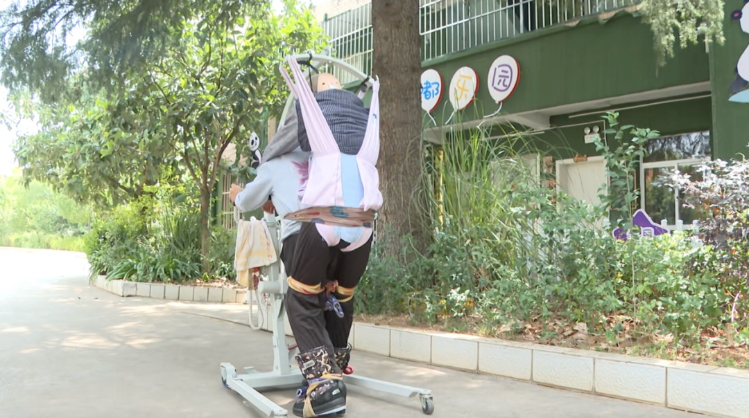 邓桂英穿着高跟鞋带儿子进行康复训练。