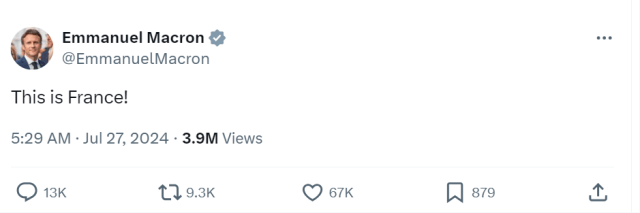 当地时间7月26日,第33届夏季奥林匹克运动会开幕式在法国巴黎举行。法国总统马克龙当日在社交媒体平台X上用英语和法语发布多条帖文,评价奥运会开幕式,其中一条用英语写道:“这就是法国!”