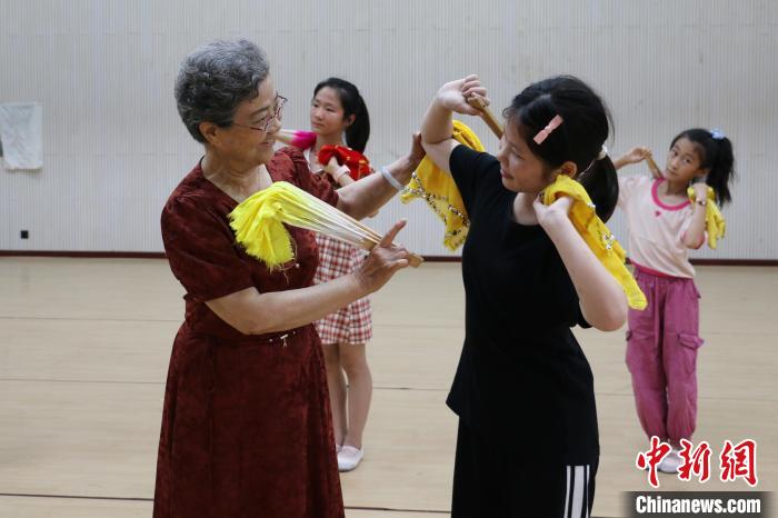 6月25日,中国国家级非物质文化遗产代表性项目花鼓灯(凤台花鼓灯)国家级代表性传承人邓虹(左一)在指导学生做花鼓灯舞蹈动作。(凤台县委宣传部供图)