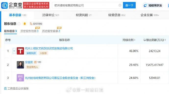 据企查查股权穿透显示,宗庆后退出股东行列,杭州娃哈哈集团现由宗馥莉、杭州上城区文商旅投资控股集团有限公司、杭州娃哈哈集团有限公司基层工会联合委员会(职工持股会)3名股东共同持股。