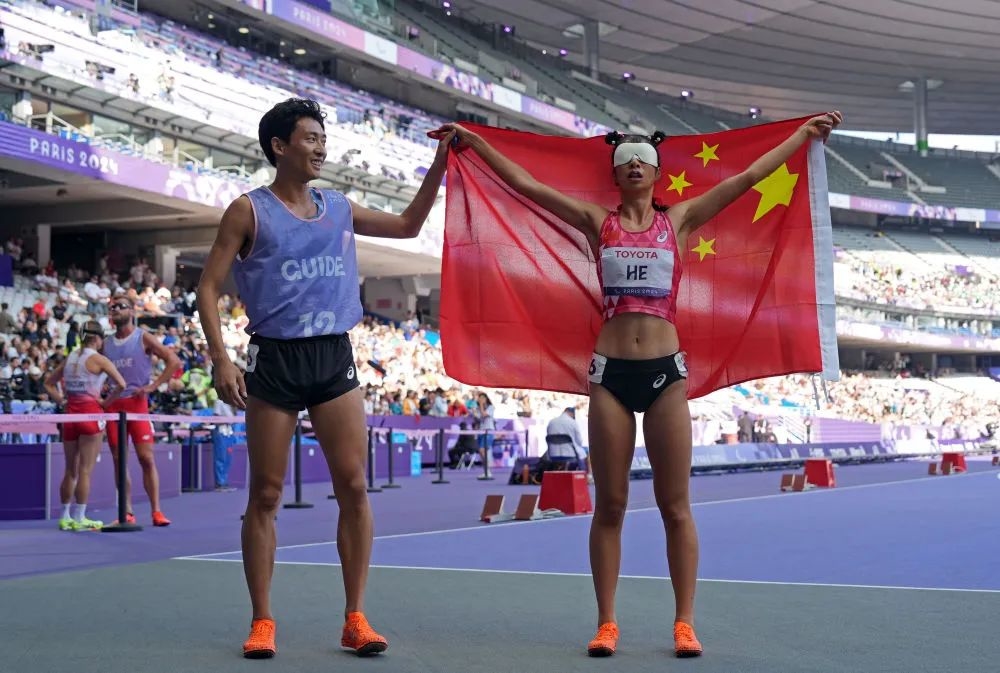 9月2日,中国选手何珊珊(右)与领跑员游俊杰在比赛中。新华社记者 才扬 摄