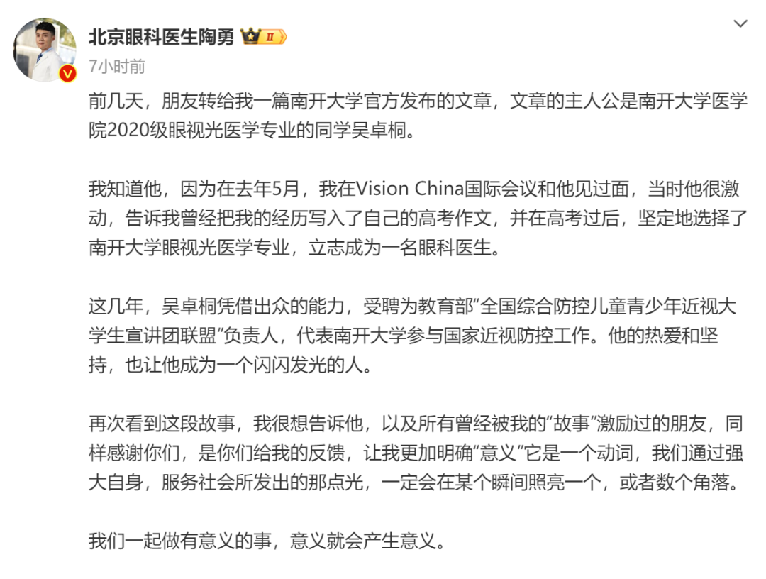 来源:中国青年报(ID:zqbcyol 记者:张小松)综合南开大学、@北京眼科医生陶勇