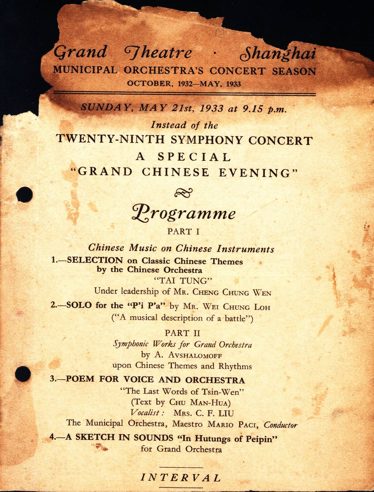 1933年5月21日21:15,上海工部局乐队演出了阿隆的《晴雯绝命词》《北平胡同》《琴心波光》。