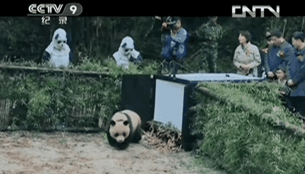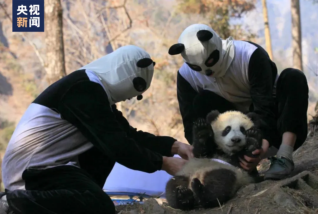 为了避免幼崽对人类产生依赖,野化培训中必须尽可能减少与其接触。每次给母兽投喂食物或给幼崽做必要的体检,饲养员都会穿上熊猫伪装服,还会在衣服上喷洒母兽的尿液或涂抹粪便,让自己从视觉、味道上都和真实的熊猫更接近,以此“迷惑”幼崽。