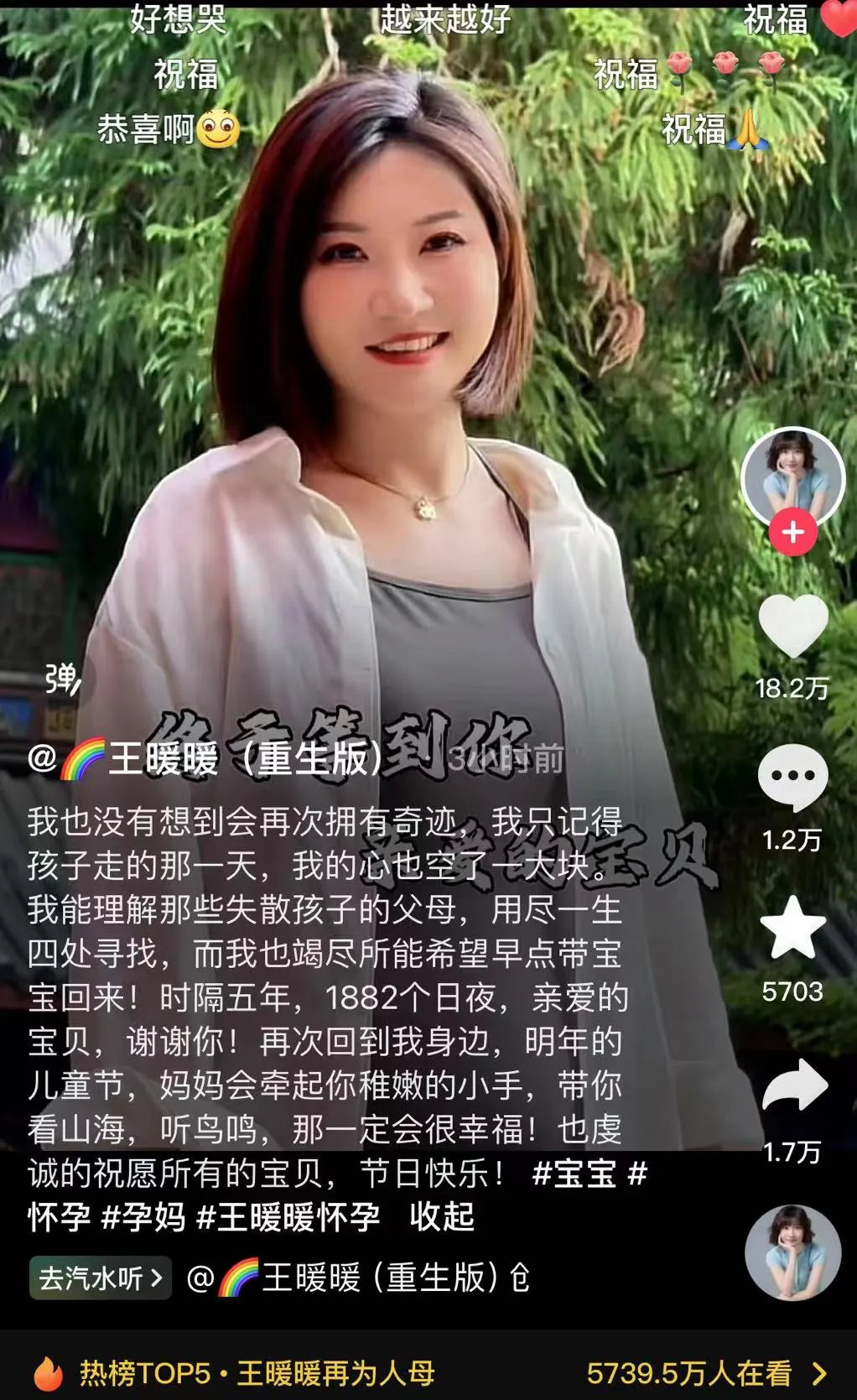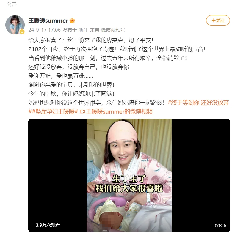 孕妇坠崖案当事人王暖暖怀孕三个月被丈夫推下悬崖,奇迹生还,曾被判定不孕不育。9月17日,她官宣生子:“谢谢你亲爱的宝贝,你让妈妈迎来了圆满!