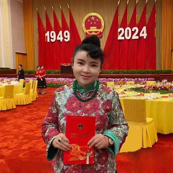 2024年9月30日,参加中华人民共和国成立75周年招待会的她,身穿“花开时节”对襟中式上衣,喜气,大气。
