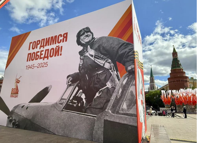 5月5日,在莫斯科市中心拍摄的“为胜利骄傲”宣传栏。新华社记者 郑开君 摄