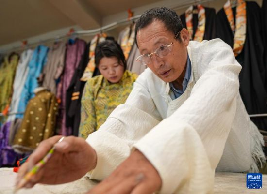 在拉萨雪堆白传统手工艺术学校,60岁的西藏自治区级非物质文化遗产项目藏族服饰(拉萨服饰)代表性传承人洛桑麦朗,与学徒一道研究、制作藏装。从艺四十余载,他培养了百余名弟子,还参与编撰教材、建立藏族服饰数据库等工作。在他的巧手下,新式藏装将传统与现代交融,让非遗技艺与现代审美碰撞,成为街头一道靓丽的风景。(新华社记者 晋美多吉 摄)
