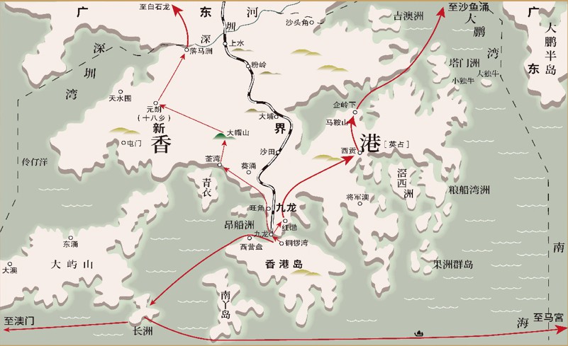 1942年1月9日,邹韬奋、茅盾等20余人第一批秘密撤离香港,到达宝安白石龙。夏衍、司徒慧敏、蔡楚生等21人,从水路经长洲岛、澳门撤离香港赴桂林。何香凝、柳亚子等人乘船经长洲岛离开香港到达海丰马宫。