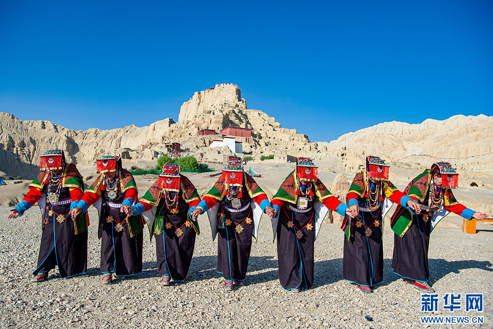 札达县群众在古格王国遗址脚下表演“宣舞”(6月12日摄)。“宣舞”是西藏阿里民间传统舞蹈,融合藏戏、舞蹈、说唱等传统民间艺术,内容涵盖礼仪、风俗、节庆等。2008年,被列入国家级非物质文化遗产名录。新华网 旦增努布 摄