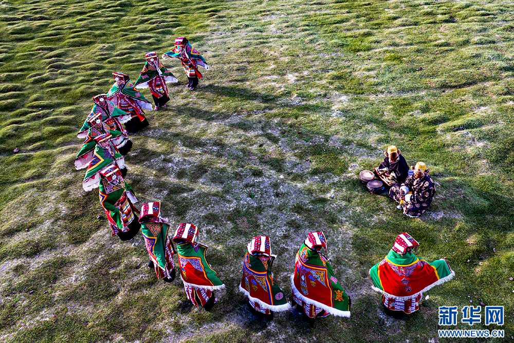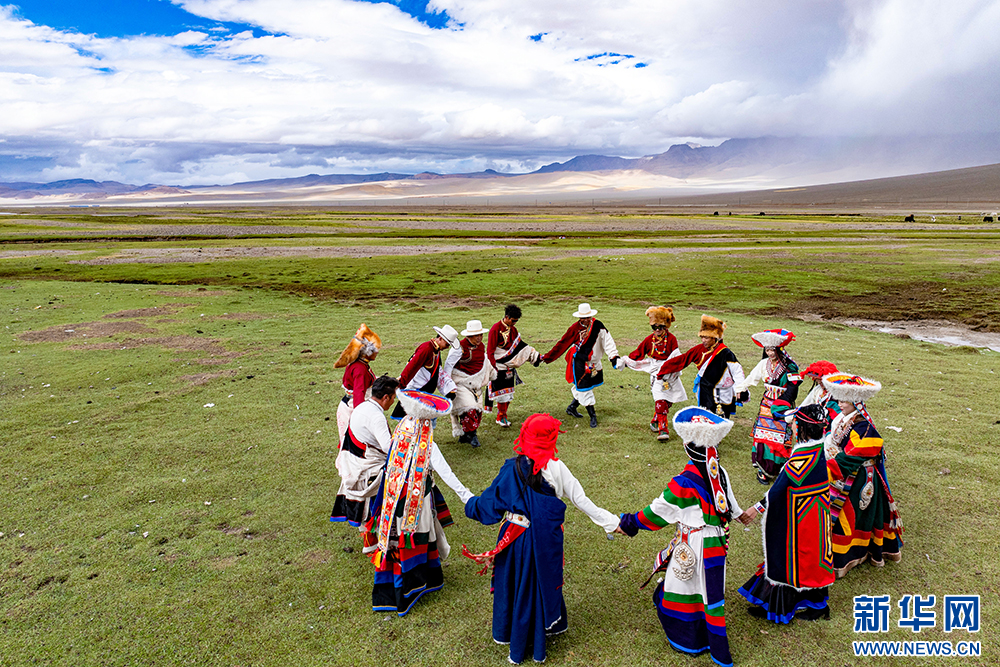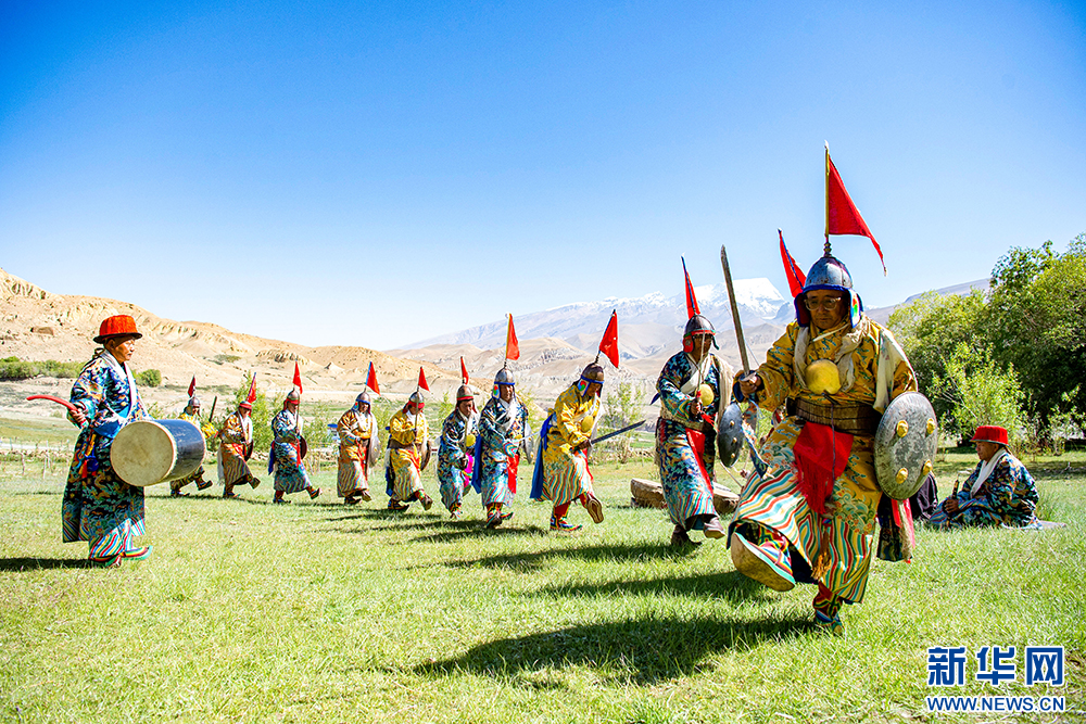 普兰县西德村村民在表演“果尔孜舞”(6月10日摄)。“果尔孜舞”有1300多年的历史,传承沿袭传统的口口相传。2011年,被列入国家级非物质文化遗产名录。新华网 旦增努布 摄