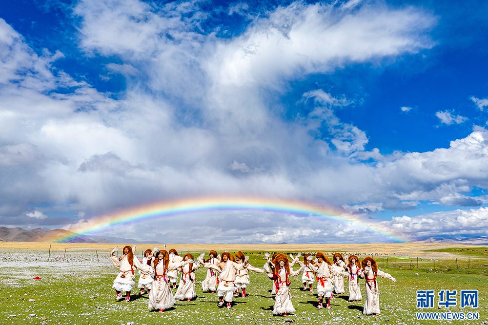 措勤县艺术团在表演自治区级非物质文化遗产磁石“帕”卓(6月23日摄)。该舞蹈动作优美欢快、充满动感,带有弹性舞步。近年来,措勤县将磁石“帕”卓改编为课间操进校园,让学生感受当地非遗魅力。新华网 旦增努布 摄