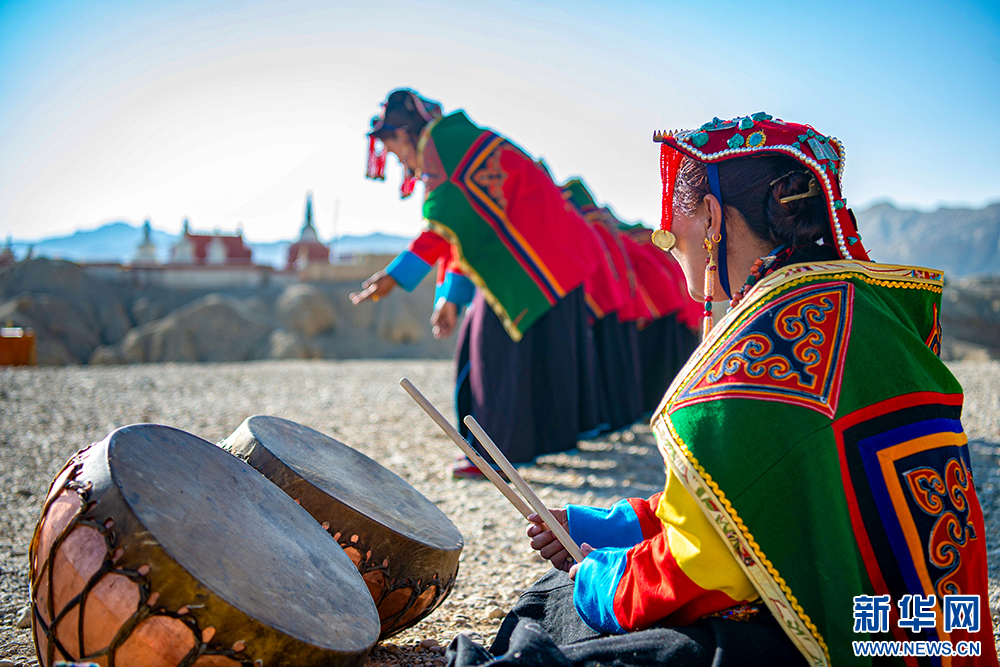 自治区级“宣舞”非遗传承人央金(右)在古格王国遗址脚下伴奏鼓乐(6月12日摄)。新华网 旦增努布 摄