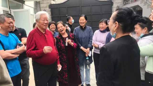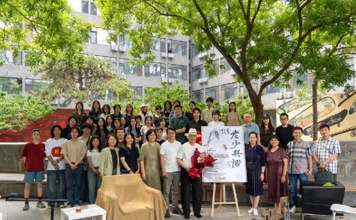(张立辰教与夫人胡萍在中央美术学院举办的“老少共话”活动后与师生合影)