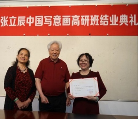 张立辰教授(中)与夫人胡萍(左)、中央美院校党委副书记王晓琳(右)一起合影