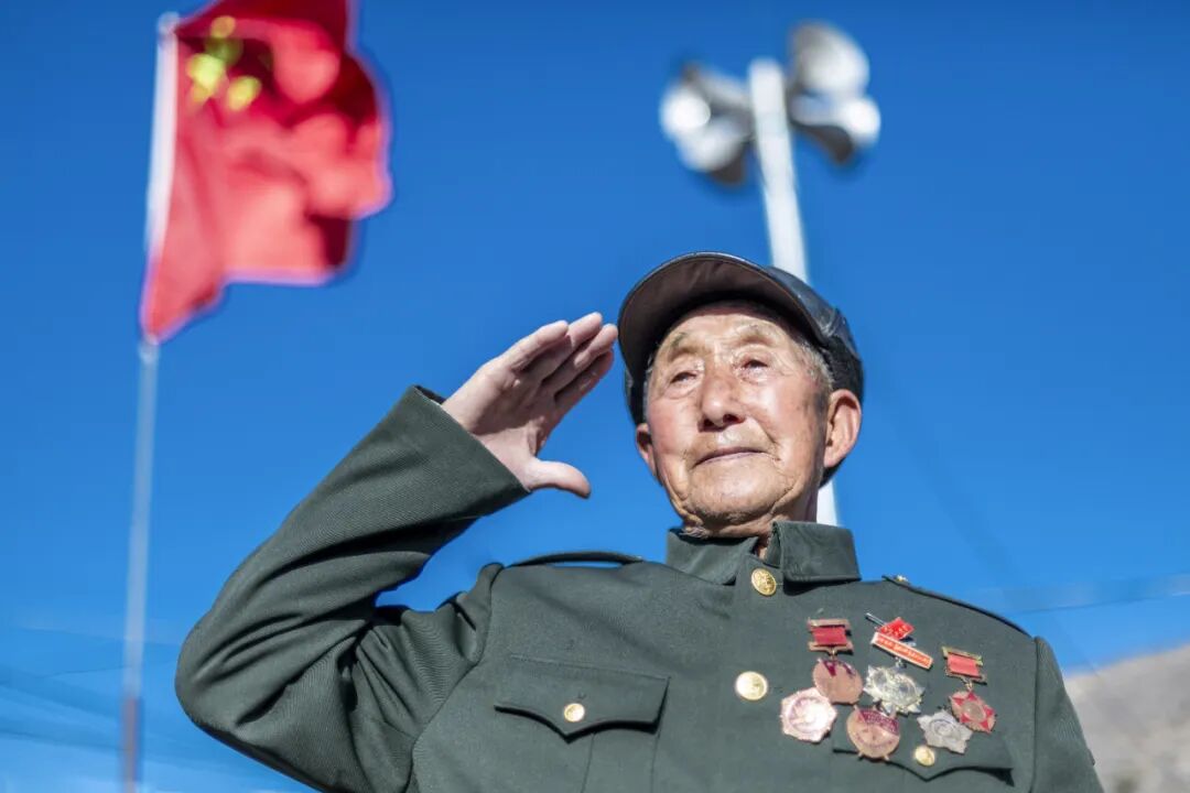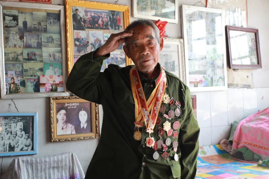 他们中间让我印象最深刻的是张军。他参加了抗日战争、解放战争和抗美援朝战争,最危险的时候全连只剩下两个人。退伍后,他回村担任村长等职务。我们见面时他已经95岁了,住在市区的疗养院,但每到村委会换届选举,他都会回去投票。有一年,我陪他回村,在村委会广场,他敬了个军礼,我按下快门,飘扬的国旗和他喊了半辈子的喇叭成了最好的背景。