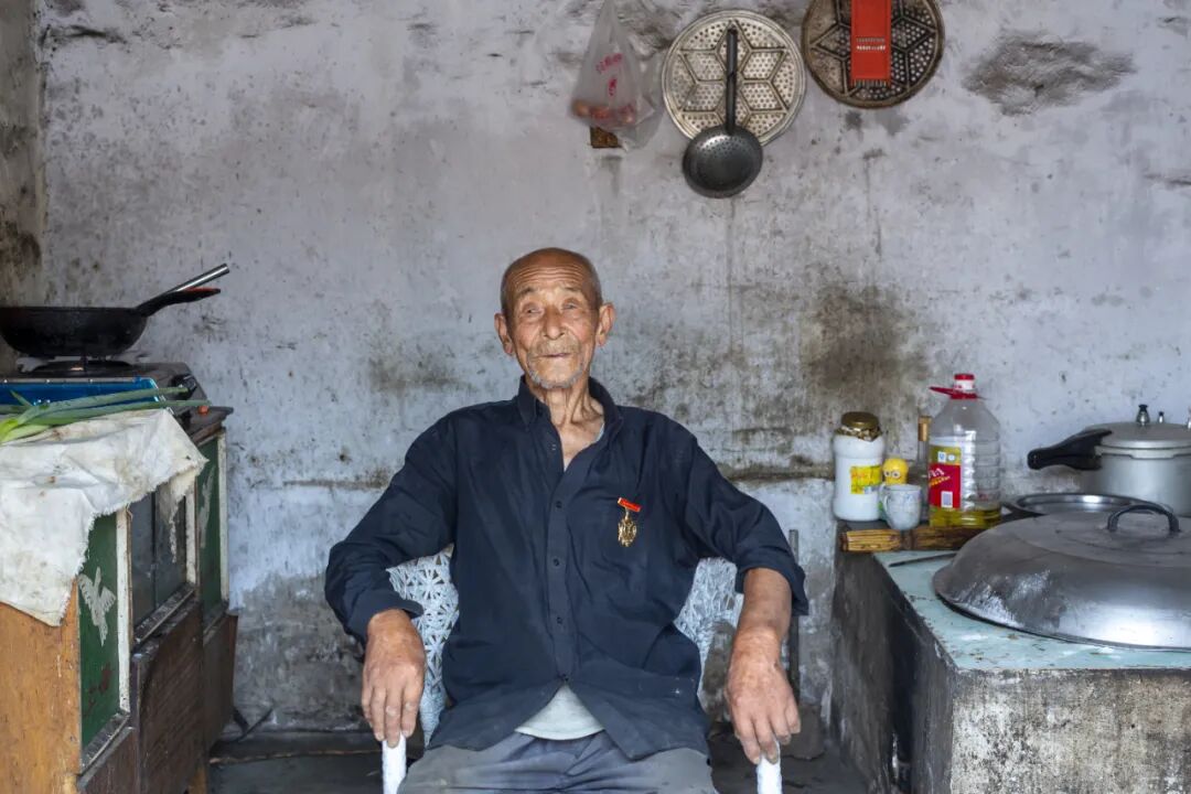 我让老人戴上奖章,狭小的农房里,支起三脚架都困难,我单膝跪地给老人拍了照片。