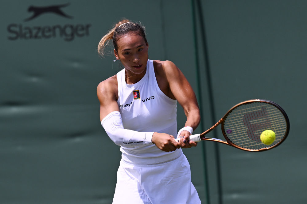 7月1日,郑钦文在温网比赛中回球。新华社记者 赵丁喆 摄