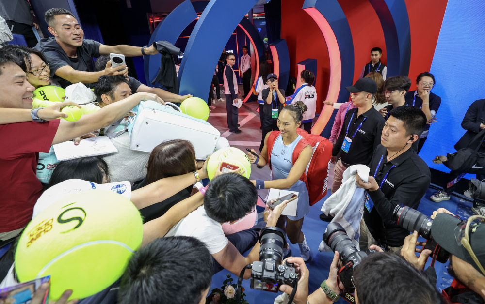 9月27日,郑钦文(中)在比赛后和观众互动。新华社记者 白雪飞 摄