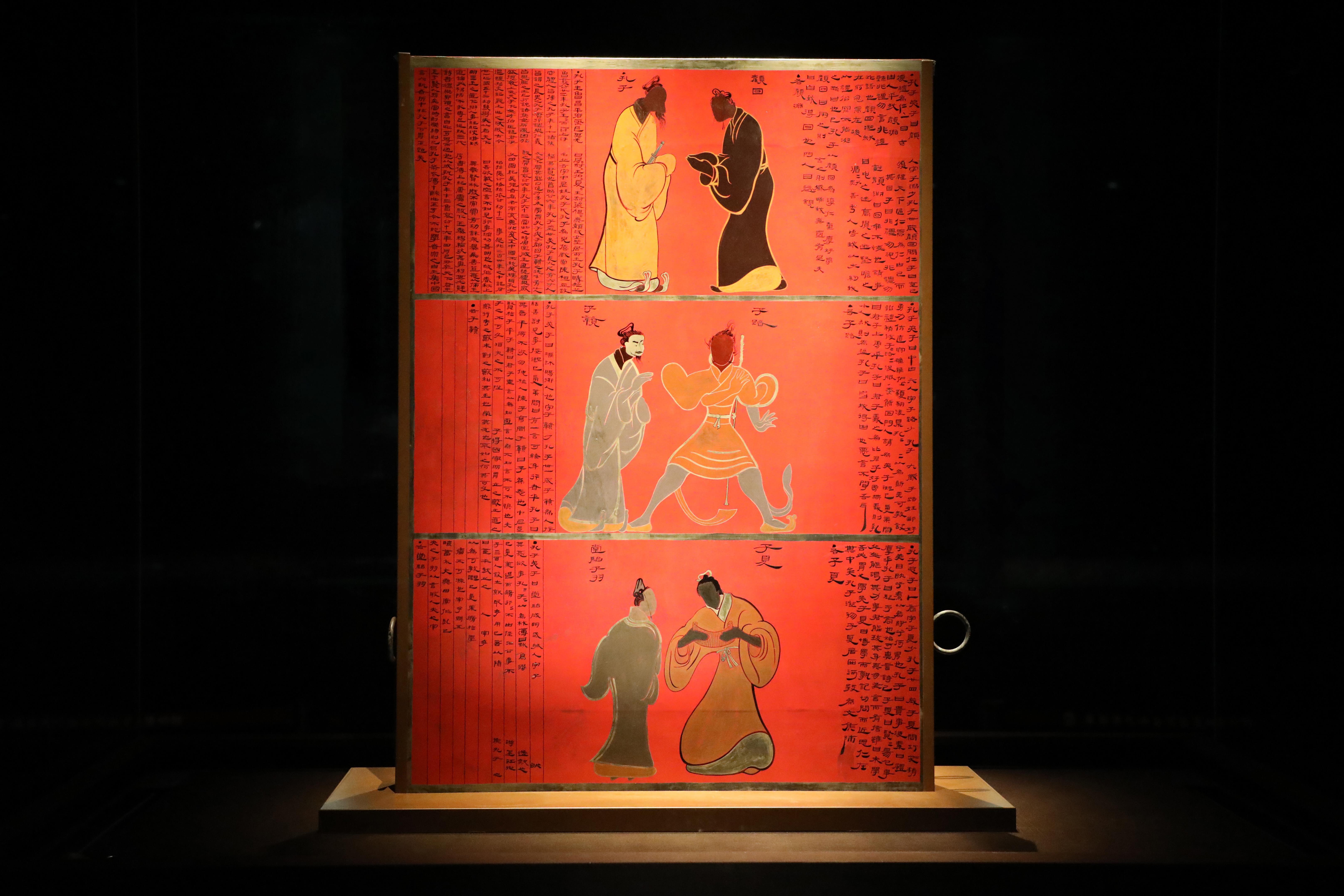 △《文博日历》此前介绍过“至圣先师孔子最早的画像”,图为南昌汉代海昏侯国遗址博物馆藏的孔子徒人图漆衣镜复制件。