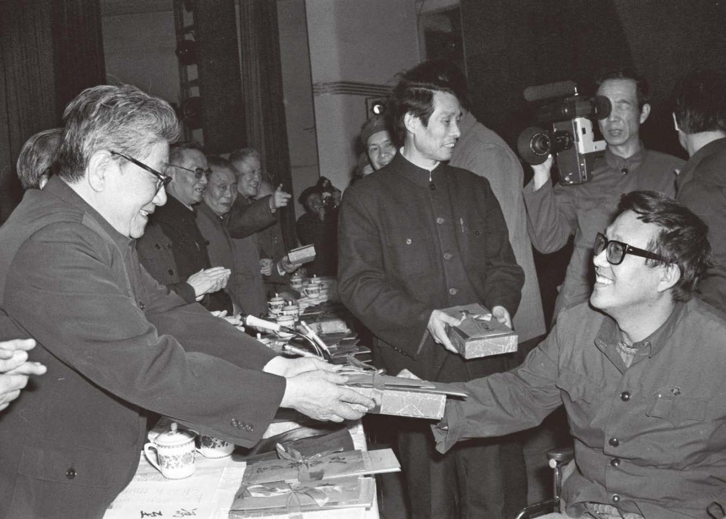 1983年,史铁生(右一)的《我的遥远的清平湾》获得全国优秀短篇小说奖。图为1984年3月19日,他在北京参加授奖大会,坐着轮椅上台领奖。(新华社记者 张桂玉/摄)