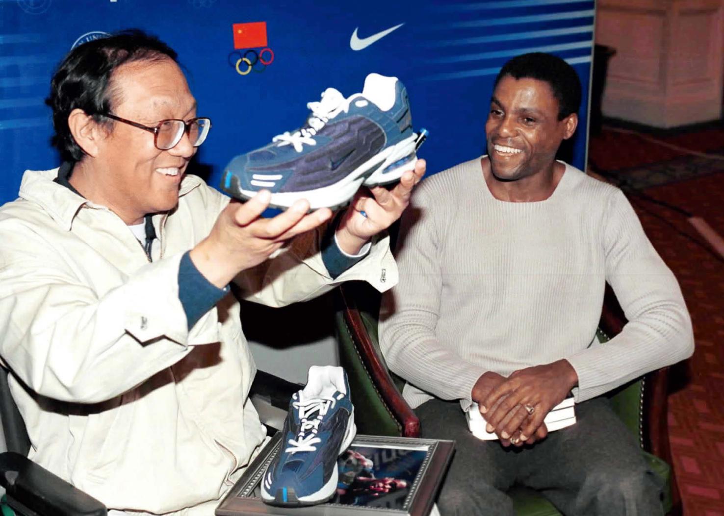 2001年3月20日,史铁生(左)与美国田径运动员刘易斯在北京相会。刘易斯将有自己签名的照片和运动鞋送给史铁生,史铁生送给刘易斯自己的一套文集。(新华社记者 陈晓伟/摄)