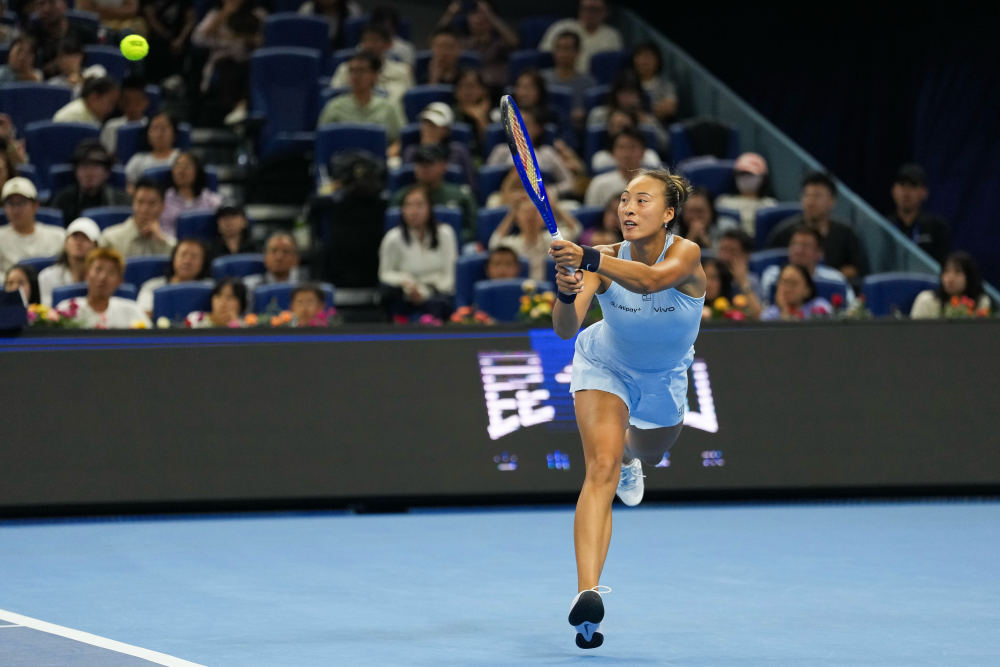 9月29日,郑钦文在比赛中回球。新华社记者 那宇奇 摄