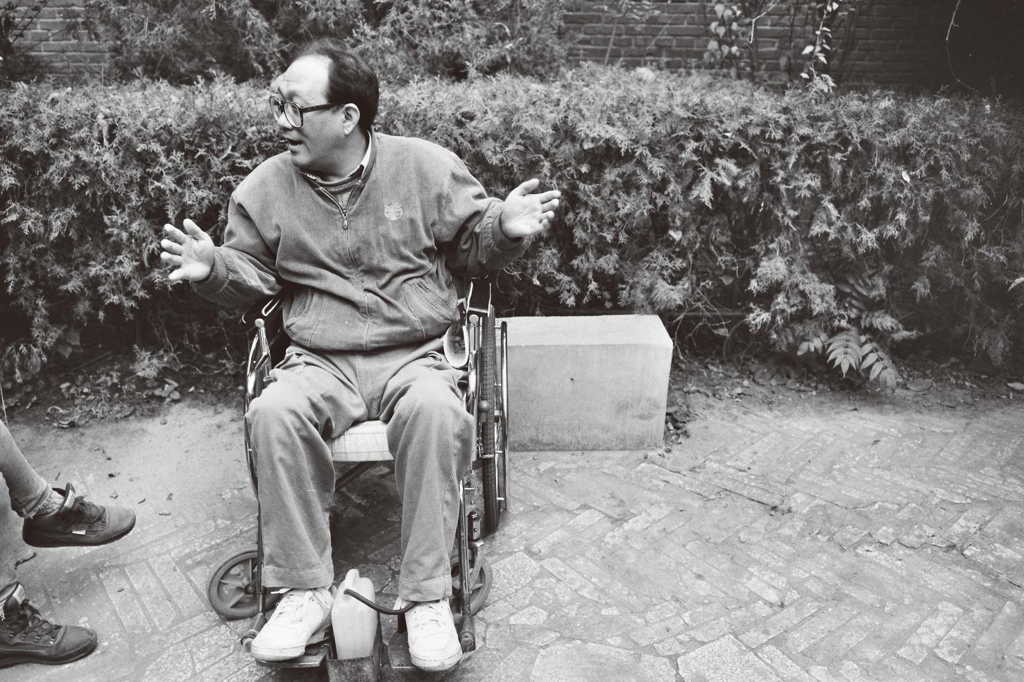 1995年9月28日,史铁生在北京和朋友聊天。(黑明/摄 视觉中国)