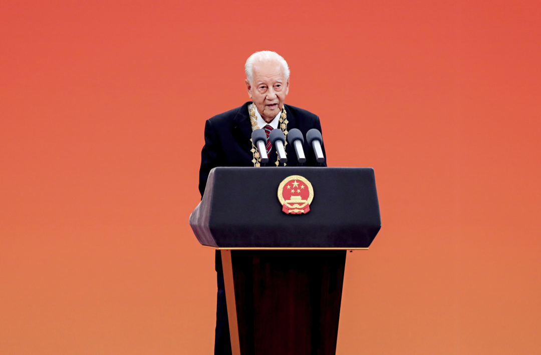 ·2019年9月29日,中华人民共和国国家勋章和国家荣誉称号颁授仪式上,“共和国勋章”获得者黄旭华发言。(IC photo)
