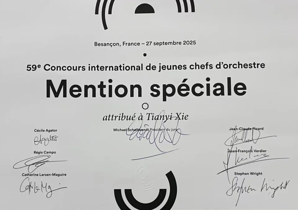 中央音乐学院在贝桑松国际青年指挥家比赛这项顶级赛事中屡创佳绩,持续为中国指挥界注入新生力量。近年来,我校学子尹炯杰曾于第57届比赛中荣获“特别提名奖”。本届谢天弈同学的再度获奖,标志着我校在指挥人才培养上的雄厚实力和所取得的连续性卓越成果。