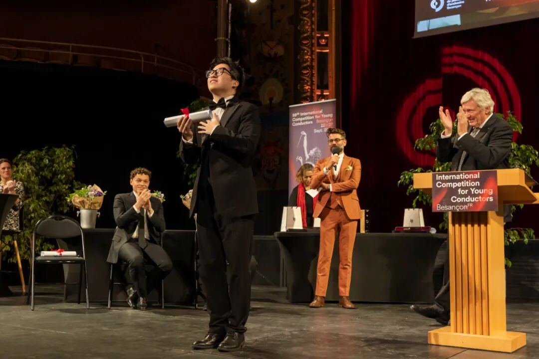 9月27日晚,在刚刚落幕的第59届法国贝桑松国际青年指挥家比赛中,年仅21岁的中国选手、我校指挥系本科三年级学生谢天弈凭借精彩演绎,成为当晚焦点,独揽“观众最喜爱奖”“乐团最喜爱奖”和“特别提名奖”三项殊荣,成为本届赛事最年轻、也是获奖数量最多的选手,创下了中国大陆选手在该赛事历史上的最佳成绩!其出色表现获得了评委会“才华横溢,潜力无限”的高度评价,在国际顶级赛场上展现了央音学子的风采!