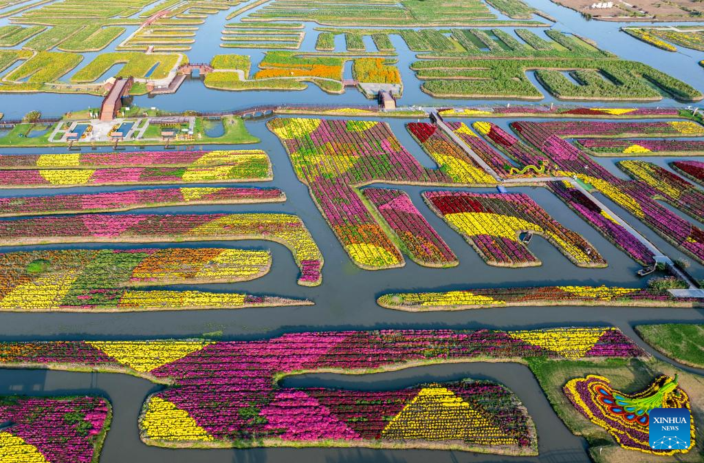 An aerial drone photo taken on Oct. 11, 2025 shows the scenery of blooming chrysanthemums in Xinghua, east China's Jiangsu Province. (Photo by Zhou Shegen/Xinhua)