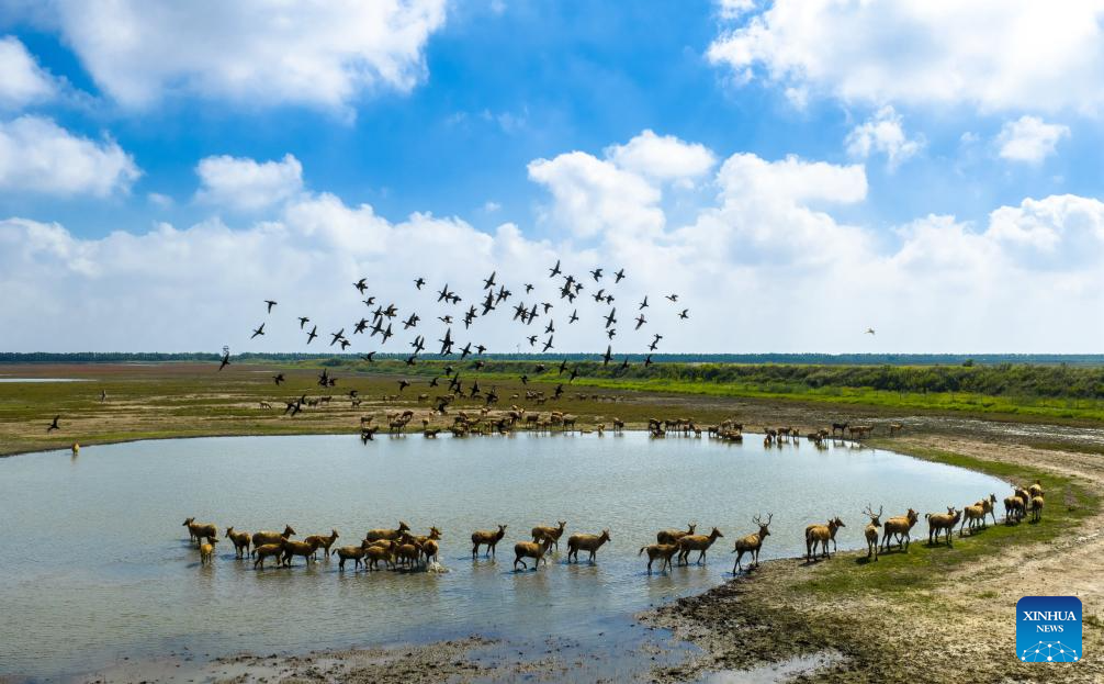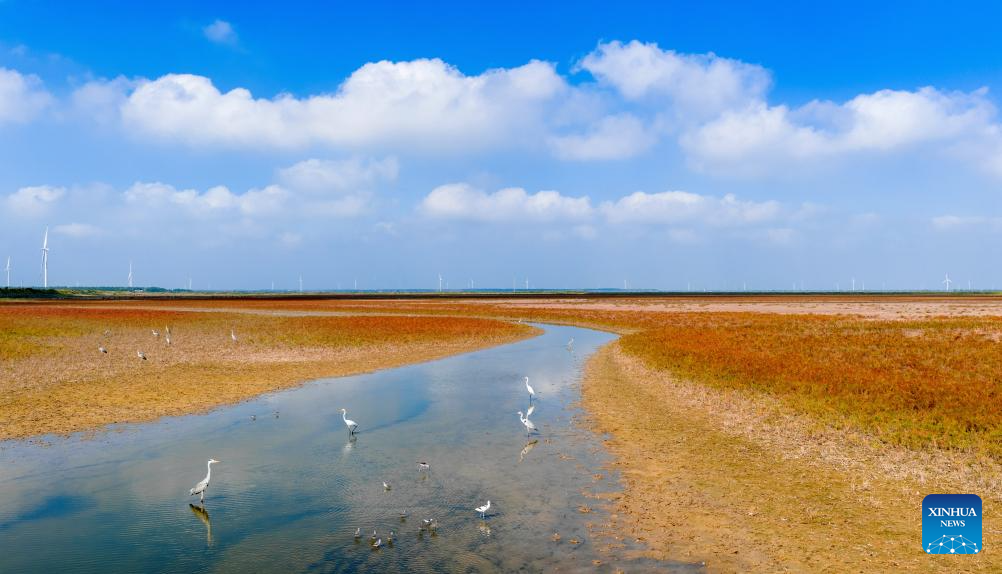 An aerial drone photo taken on Oct. 11, 2025 shows the scenery of a wetland in Dongtai, east China's Jiangsu Province. (Photo by Sun Jialu/Xinhua)
